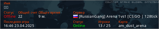 Играет на Counter Strike Global Offensive сервере. Страна: РоссияПервый раз замечен 14:39 23.04.2025