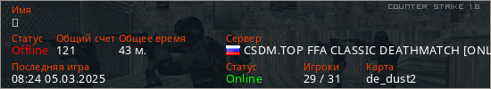 Играет на Counter Strike 1.6 сервере. Страна: РоссияПервый раз замечен 02:53 09.08.2020