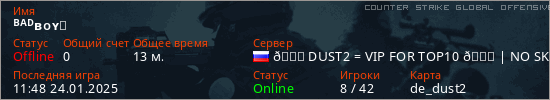Играет на Counter Strike Global Offensive сервере. Страна: РоссияПервый раз замечен 13:03 18.01.2025
