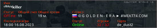 Играет на Counter Strike 1.6 сервере. Страна: РоссияПервый раз замечен 18:00 16.08.2023