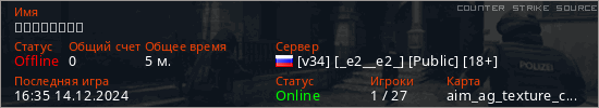Играет на Counter Strike Source сервере. Страна: РоссияПервый раз замечен 16:14 14.12.2024