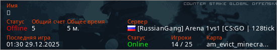 Играет на Counter Strike Global Offensive сервере. Страна: РоссияПервый раз замечен 01:13 29.12.2025