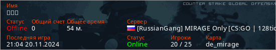 Играет на Counter Strike Global Offensive сервере. Страна: РоссияПервый раз замечен 22:12 02.02.2024