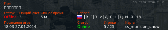 Играет на Counter Strike 1.6 сервере. Страна: РоссияПервый раз замечен 17:45 27.01.2024