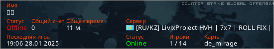 Играет на Counter Strike Global Offensive сервере. Страна: КазахстанПервый раз замечен 11:38 28.01.2025