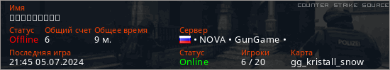 Играет на Counter Strike Source сервере. Страна: РоссияПервый раз замечен 21:34 05.07.2024