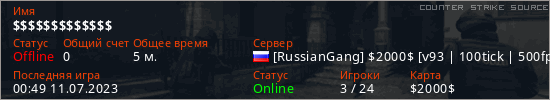 Играет на Counter Strike Source сервере. Страна: РоссияПервый раз замечен 00:47 11.07.2023