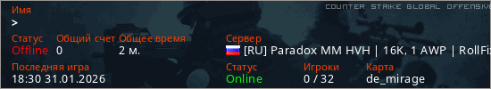 Играет на Counter Strike Global Offensive сервере. Страна: РоссияПервый раз замечен 18:30 31.01.2026