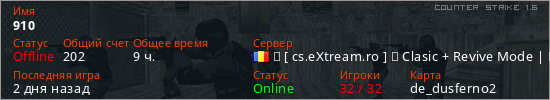 Играет на Counter Strike 1.6 сервере. Страна: РумынияПервый раз замечен 13:53 23.01.2025