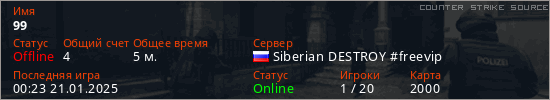 Играет на Counter Strike Source сервере. Страна: РоссияПервый раз замечен 00:07 21.01.2025