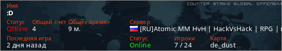 Играет на Counter Strike Global Offensive сервере. Страна: РоссияПервый раз замечен 16:48 23.01.2026