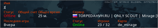 Играет на Counter Strike Global Offensive сервере. Страна: РоссияПервый раз замечен 00:29 25.01.2026