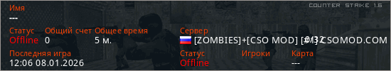 Играет на Counter Strike 1.6 сервере. Страна: РоссияПервый раз замечен 12:04 08.01.2026