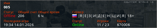 Играет на Counter Strike 1.6 сервере. Страна: РоссияПервый раз замечен 22:41 15.02.2020