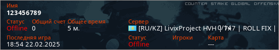Играет на Counter Strike Global Offensive сервере. Страна: КазахстанПервый раз замечен 18:40 22.02.2025