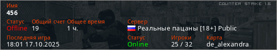 Играет на Counter Strike 1.6 сервере. Страна: РоссияПервый раз замечен 18:23 26.06.2023