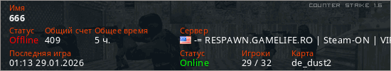 Играет на Counter Strike 1.6 сервере. Страна: СШАПервый раз замечен 05:06 16.02.2025