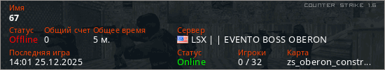Играет на Counter Strike 1.6 сервере. Страна: СШАПервый раз замечен 13:53 25.12.2025
