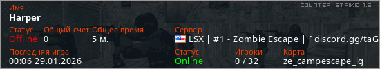 Играет на Counter Strike 1.6 сервере. Страна: СШАПервый раз замечен 00:04 29.01.2026