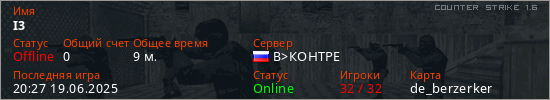 Играет на Counter Strike 1.6 сервере. Страна: РоссияПервый раз замечен 15:48 15.06.2025