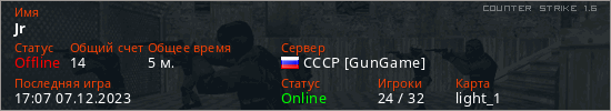 Играет на Counter Strike 1.6 сервере. Страна: РоссияПервый раз замечен 17:00 07.12.2023