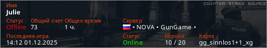 Играет на Counter Strike Source сервере. Страна: РоссияПервый раз замечен 16:49 15.09.2025