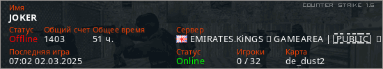Последний раз был в сети 07:02 02.03.2025 Игрок с таким ником замечен на 53 серверах