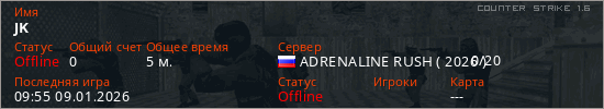 Играет на Counter Strike 1.6 сервере. Страна: РоссияПервый раз замечен 09:53 09.01.2026