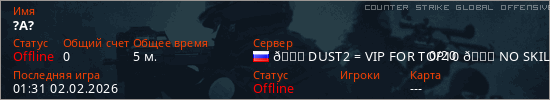 Играет на Counter Strike Global Offensive сервере. Страна: РоссияПервый раз замечен 01:21 02.02.2026