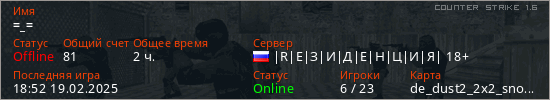 Последний раз был в сети 18:52 19.02.2025 Игрок с таким ником замечен на 23 серверах