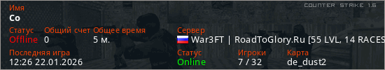 Играет на Counter Strike 1.6 сервере. Страна: РоссияПервый раз замечен 12:24 22.01.2026