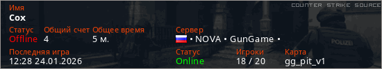Играет на Counter Strike Source сервере. Страна: РоссияПервый раз замечен 12:22 24.01.2026