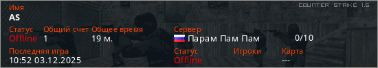 Играет на Counter Strike 1.6 сервере. Страна: РоссияПервый раз замечен 18:56 30.08.2025