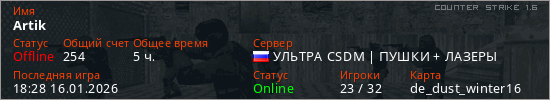 Играет на Counter Strike 1.6 сервере. Страна: РоссияПервый раз замечен 16:10 19.12.2025