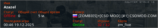 Играет на Counter Strike 1.6 сервере. Страна: РоссияПервый раз замечен 00:44 19.12.2025