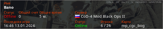 Играет на Call of Duty 4: Modern Warfare сервере. Страна: РоссияПервый раз замечен 16:44 13.01.2026