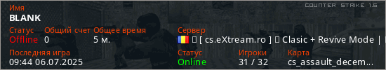 Играет на Counter Strike 1.6 сервере. Страна: РумынияПервый раз замечен 09:26 06.07.2025