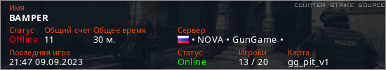 Играет на Counter Strike Source сервере. Страна: РоссияПервый раз замечен 04:26 12.08.2023