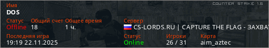 Играет на Counter Strike 1.6 сервере. Страна: РоссияПервый раз замечен 15:19 21.10.2021