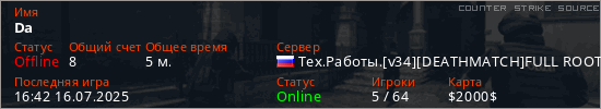 Играет на Counter Strike Source сервере. Страна: РоссияПервый раз замечен 16:30 16.07.2025