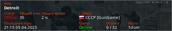 Играет на Counter Strike 1.6 сервере. Страна: РоссияПервый раз замечен 20:31 06.03.2024