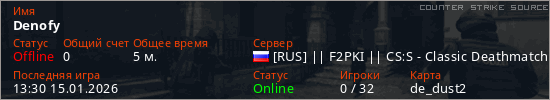 Играет на Counter Strike Source сервере. Страна: РоссияПервый раз замечен 13:24 15.01.2026