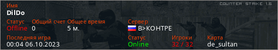 Играет на Counter Strike 1.6 сервере. Страна: РоссияПервый раз замечен 23:45 05.10.2023