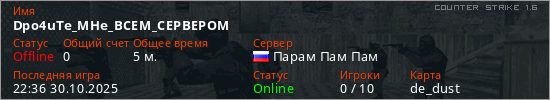 Играет на Counter Strike 1.6 сервере. Страна: РоссияПервый раз замечен 22:30 30.10.2025