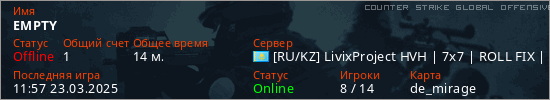 Играет на Counter Strike Global Offensive сервере. Страна: КазахстанПервый раз замечен 20:04 21.03.2025