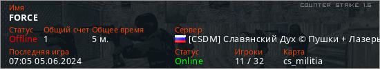 Играет на Counter Strike 1.6 сервере. Страна: РоссияПервый раз замечен 07:03 05.06.2024