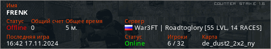 Играет на Counter Strike 1.6 сервере. Страна: РоссияПервый раз замечен 16:32 17.11.2024