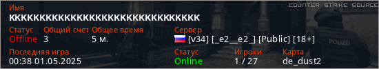 Играет на Counter Strike Source сервере. Страна: РоссияПервый раз замечен 00:36 01.05.2025