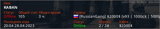 Играет на Counter Strike Source сервере. Страна: РоссияПервый раз замечен 21:50 03.04.2023