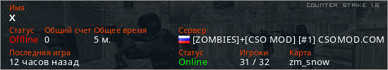 Играет на Counter Strike 1.6 сервере. Страна: РоссияПервый раз замечен 15:07 02.02.2026